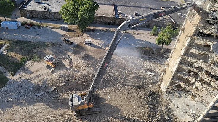 “The use of the high-reach was decided because it is the most efficient and clean method to demolish these types of buildings,” Pawlik says. Alpine made a commitment to practice “top-down and controlled demolition” several years ago, he adds.