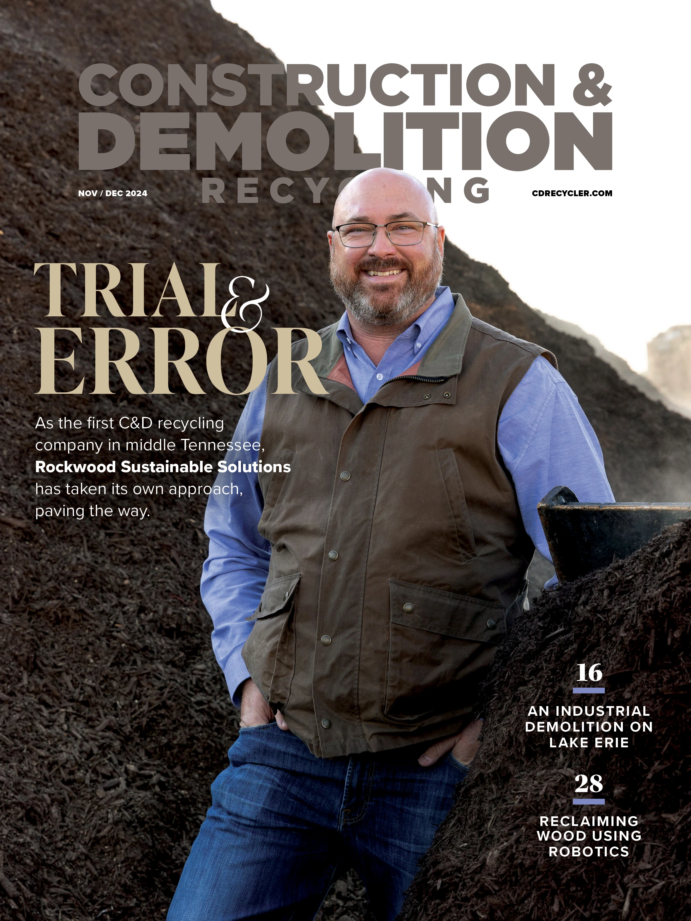 That was all the feedback Young needed to begin developing a method to sort construction materials, and it signaled the start of a new mixed construction and demolition (C&D) recycling chapter for Rockwood, a Lebanon, Tennessee-based company that got its start in shingle recycling. Now, it’s a full-service C&D recycler that handles wood, concrete, plastics, cardboard, tires, metal and drywall.