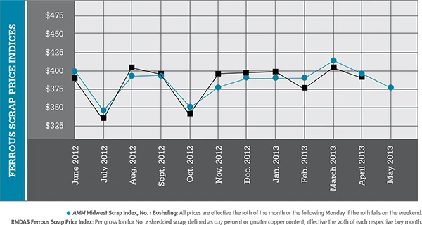 Such improvements in purchasing were not universal, however, as other recyclers continue to report disappointment at the scale house. As well, the increased supplies have not yet been paralleled by increased demand, leading to another month of lower ferrous scrap prices in the May buying period.