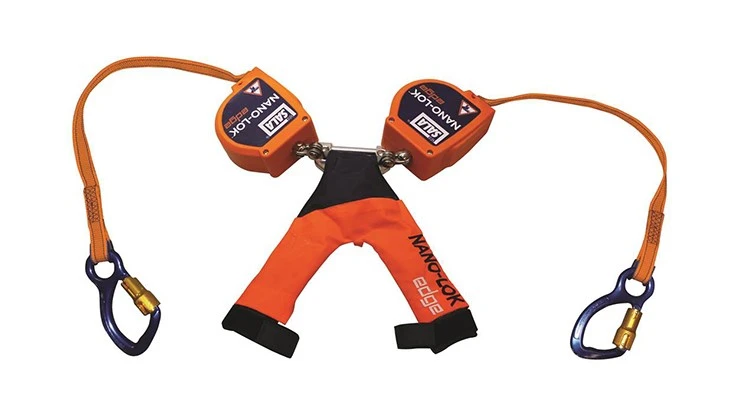 These Twin-Leg Nano-Loks are used as part of a personal fall protection system that connects two self-retracting lifelines/devices (SRLs/SRDs) directly under the dorsal D-ring of a worker’s harness. The Twin-Leg Nano-Lok edge is intended to be anchored at foot-level, is designed for sharp and/or leading-edge applications and incorporates an energy absorber. The Twin-Leg Nano-Lok Wrap Back is intended for wrapping around an anchor and incorporates a similar energy absorber.