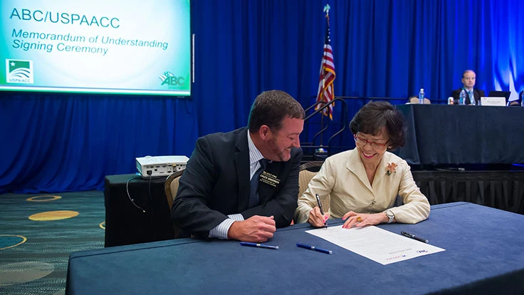The Associated Builders and Contractors (ABC), Washington, and the U.S. Pan Asian American Chamber of Commerce (USPAACC), Washington, signed a memorandum of understanding (MOU) calling for the two organizations to work jointly toward the goal of equal opportunity among all contractors to compete for and win contracts to build federal, state and locally funded construction projects. The agreement was signed by Chuck Goodrich, ABC 2017 chair, ABC CEO Mike Bellaman and USPAACC CEO Susan Allen during ABC’s board of directors meeting on June 21.