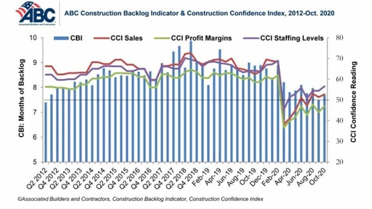 Associated Builders and Contractors (ABC) has reported that its Construction Backlog Indicator (CBI) rebounded to 7.7 months in October, an increase of 0.2 months from September’s reading, according to an ABC member survey conducted from Oct. 20 to Nov. 5. Backlog is 1.2 months lower than in October 2019.