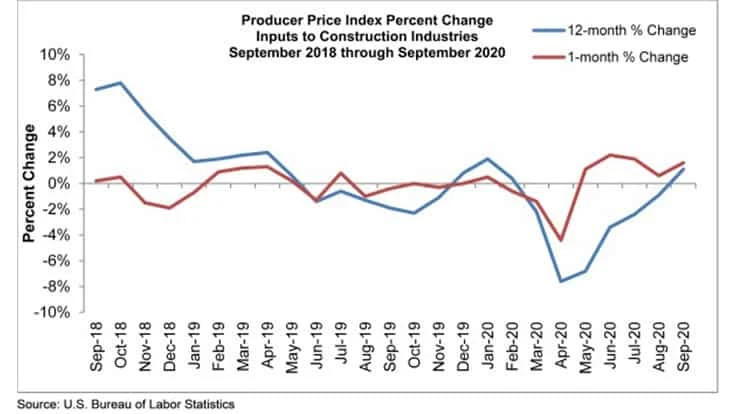 “That may be changing,” says Basu. “Materials prices expanded nearly 2 percent in September and are now higher than they were at the same time last year. Despite the lingering pandemic, the global economy has been recovering, increasing demand for key commodities. Rapid viral spread, including in Europe and parts of North America, render materials shortages more likely during the winter months. Were Congress to pass a stimulus package under current conditions, especially one offering a meaningful infrastructure component, materials prices could rise even faster.”