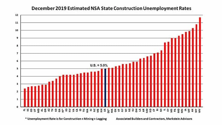 In Dec. 2019, estimated not seasonally adjusted (NSA) construction unemployment rates fell nationally in 24 states, rose in 25 states and were unchanged in New York on a year-over-year basis, according to an analysis of U.S. Bureau of Labor Statistics data released by Associated Builders and Contractors (ABC).