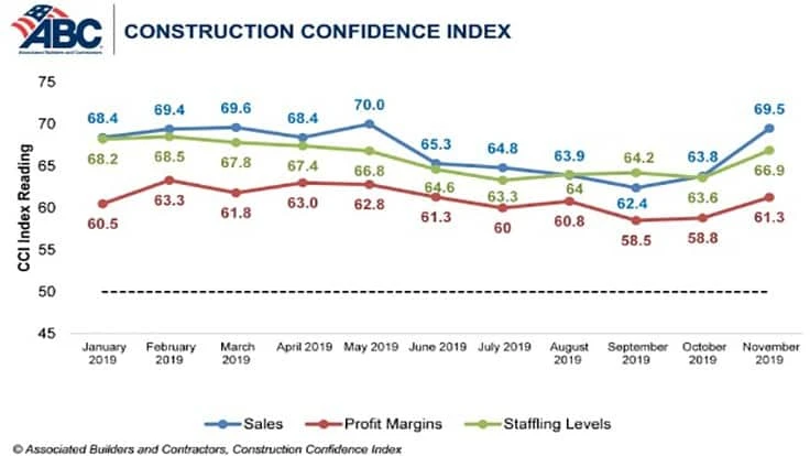 Confidence among U.S. construction industry leaders increased in November 2019 with respect to sales, profit margins and staffing, according to the Associated Builders and Contractors (ABC) Confidence Index released Jan. 23. Sales and profit margin expectations reached their highest levels since May 2019, while staffing expectations reached their highest level since April 2019.
