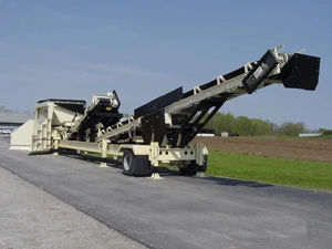 Portable units feature a heavy-duty I-beam frame on a gooseneck trailer with a fifth-wheel kingpin hitch, single axle and air brakes. The trailer includes hinged support legs and a hydraulically controlled incline conveyor.