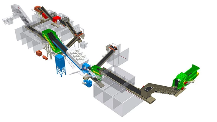 Featured is the BHS Metering Bin Liberator Class to open bags and provide the system a steady flow of material. BHS Tri-Disc screens extract organics and separate containers from fiber while Nihot Single Drum separators segregate dry recyclables from bulkier items, such as wood and rock. NRT’s In-Flight Sorting optical technology targets PET, HDPE, PP and PVC. Cardboard, mixed paper, ferrous metals and aluminum are also recovered.