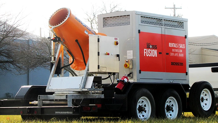BossTek, Peoria, Illinois, has announced the debut of the DustBoss DB-30 Fusion. The atomized mist unit is engineered with an electric motor and 30-kilowatt generator. The DB-30 is permanently mounted on a trailer as is the rest of the Fusion line.