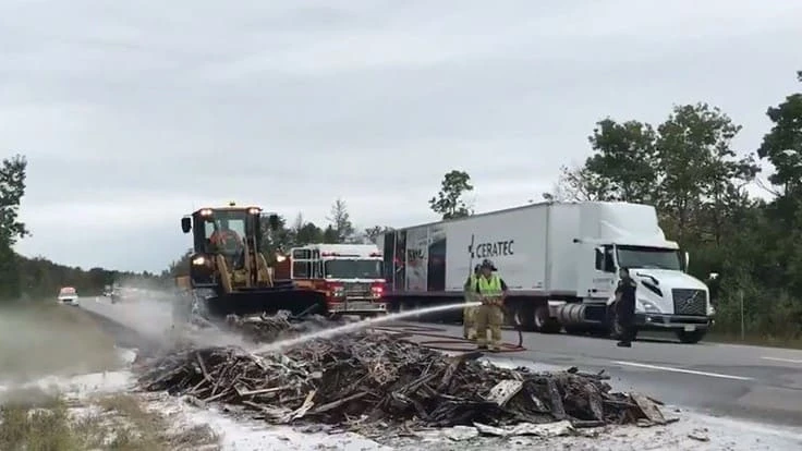 Ottawa firefighters arrived at the scene to extinguish the fire, and heavy equipment was brought in to spread out the debris to ensure the flames were fully out before crews removed the debris from the road.