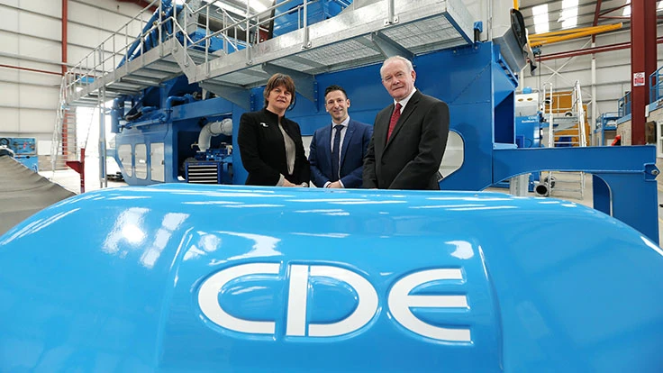 Caption: Pictured at top, CDE’s headquarters are Northern Ireland’s First Minister Arlene Foster, Brendan McGurgan, CDE’s Managing Director, and deputy First Minister Martin McGuinness.