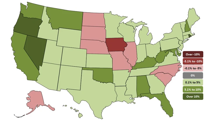 Nine states and the District of Columbia (D.C.) shed construction jobs between October 2016 and October 2017. Missouri lost the highest number of construction jobs (-5,800 jobs; -4.8 percent), followed by Iowa (-5,300 jobs; -6.6 percent), Illinois (-3,500 jobs; -1.6 percent) and North Carolina (-3,300 jobs; -1.6 percent). Iowa lost the highest percentage for the year, followed by Missouri, North Dakota (-3.9 percent; -1,300 jobs), Nebraska (-2.1 percent; -1,100 jobs), North Carolina and Illinois.
