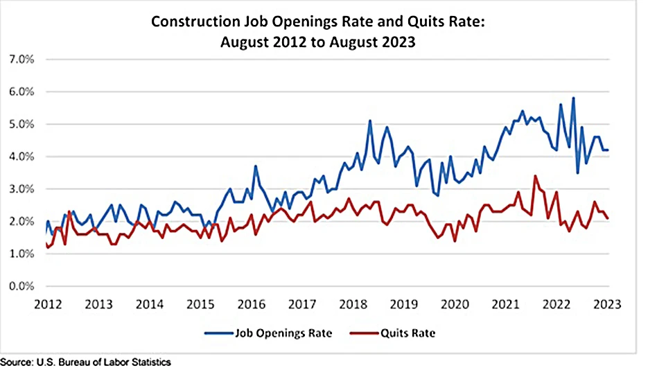 Anirban Basu, chief economist for the Washington-based Associated Builders and Contractors, says there were more unfilled positions as of the end of August 2023 than there were a year ago. Still, he says the rate at which workers are quitting has slowed, which is a hopeful sign for contractors that may counteract the difficult hiring situation.