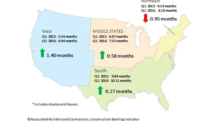 The South continues to report the lengthiest backlog on average. Regional backlog declined, however, during the first quarter, and is now back to third quarter 2015 levels. Still, many contractors in the South can look forward to many months of continuing activity.