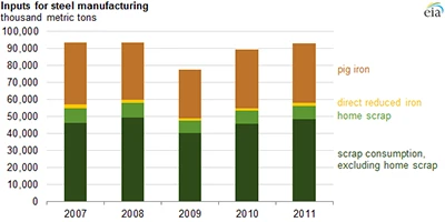 “Secondary production accounts for nearly 60 percent of U.S. aluminum production (counting both old and new scrap), while primary production accounts for almost 40 percent,” the EIA article says. “Similarly, recycling is used in most steel production. According to the U.S. Geological Survey (USGS), 40 percent of U.S. steel production in 2011 came from basic oxygen furnaces (BOF), whose inputs are almost 80 percent pig iron (molten iron), whereas 60 percent of production came from electric arc furnaces (EAF), which use more than 90 percent scrap.”
