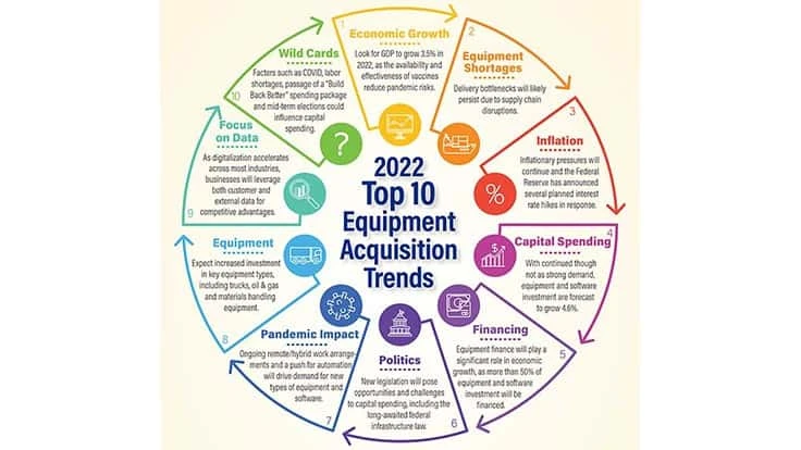 ELFA says it distilled recent research and data, including the Equipment Leasing & Finance Foundation’s 2022 Equipment Leasing & Finance U.S. Economic Outlook to forecast the following Top 10 Equipment Acquisition Trends for 2022: