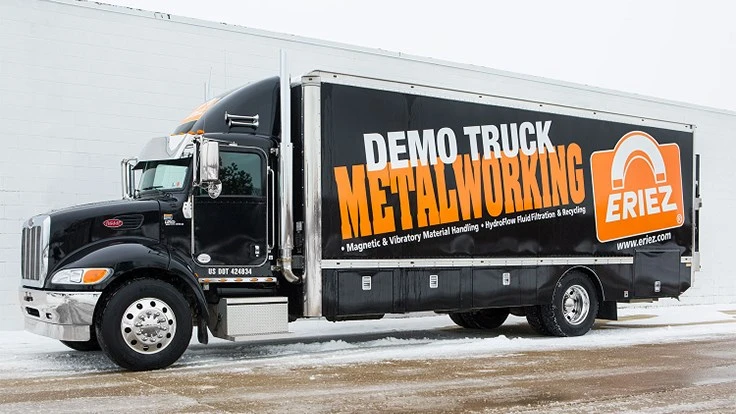 The Metalworking Demo Truck houses many of Eriez’s magnetic and vibratory material handling products as well as equipment from the company’s HydroFlow fluid recycling and fluid filtration lines. Demonstrations and workshops are tailored to assist participants in finding the material handling, fluid recycling and filtration equipment needed for their applications.