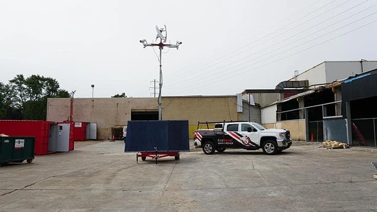 OnWatch is designed and made to withstand the harsh environments of landfills, says Fire Rover, including dust, wind and uneven surfaces. It is mobile, powered by both solar and wind, and uses 4G technology to communicate with Fire Rover agents.