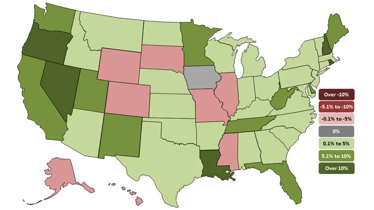 Between May and June, California had the largest numerical increases (8,100 jobs, 1 percent), followed by Florida (5,100 jobs, 1 percent), New Jersey (4,200 jobs, 2.7 percent), Louisiana (4,000 jobs, 2.6 percent), Nevada (2,100 jobs, 2.5 percent) and Missouri (2,100 jobs, 1.8 percent). New Jersey had the largest percent gain for the month, followed by Louisiana, Nevada, West Virginia (2.3 percent, 700 jobs) and New Hampshire.