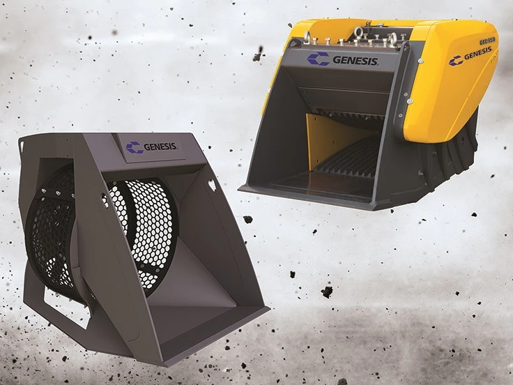 Genesis Attachments, Superior, Wisconsin, has announced the introduction of the GBS bucket screener and GBC bucket crusher. According to the company, the equipment reduces material delivery and removal costs and minimizes the need to purchase new aggregate.