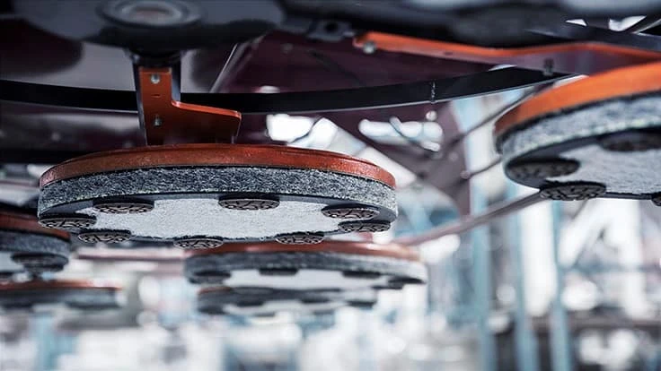 The Hipertrowel system is a six-step wet polishing process, along with three optional final steps. In addition to a power trowel, a complete set-up includes Husqvarna Hiperflex TRW tool pads, chemicals, Hipertrowel gryo drivers, power trowel attachments, a squeegee vacuum (such as the Pullman-Holt 45-20P with squeegee kit) and a hose connected to a tap.