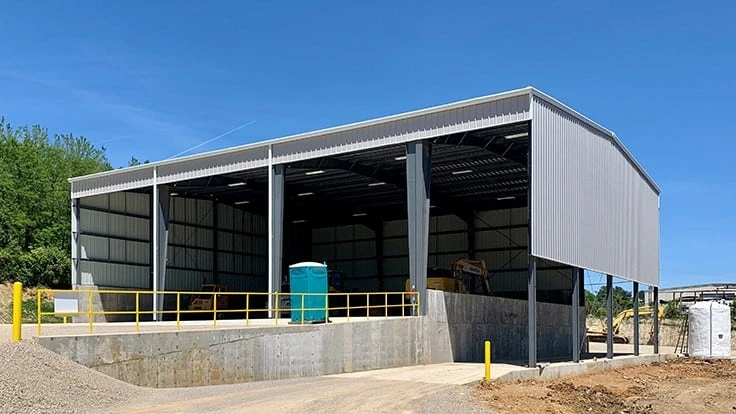 The construction project broke ground in April 2019 and took 13 months to complete; however, Meridian Waste was able to continue servicing its customers utilizing the preexisting MRF building purchased from Christiansburg-based Curtis and Associates in May 2018. Before Meridian took over the site, it housed a salvage yard and disposal and recycling facility. The new MRF is housed in a metal 80- by 100-foot building with an elevated concrete tipping floor that allows for more efficient processing.