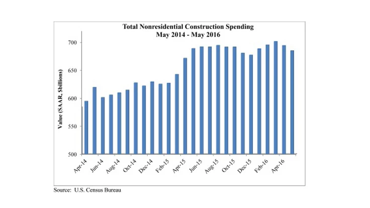Nonresidential construction spending dipped 1.3 percent in May according to analysis of U.S. Census Bureau data released by Associated Builders and Contractors (ABC). Nonresidential spending, which totaled $684.9 billion on a seasonally adjusted, annualized rate, has expanded 1.2 percent since May 2015.