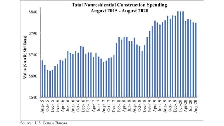 National nonresidential construction spending fell 0.1 percent in August, according to an Associated Builders and Contractors analysis of data published today by the U.S. Census Bureau. On a seasonally adjusted annualized basis, spending totaled $814.3 billion for the month.