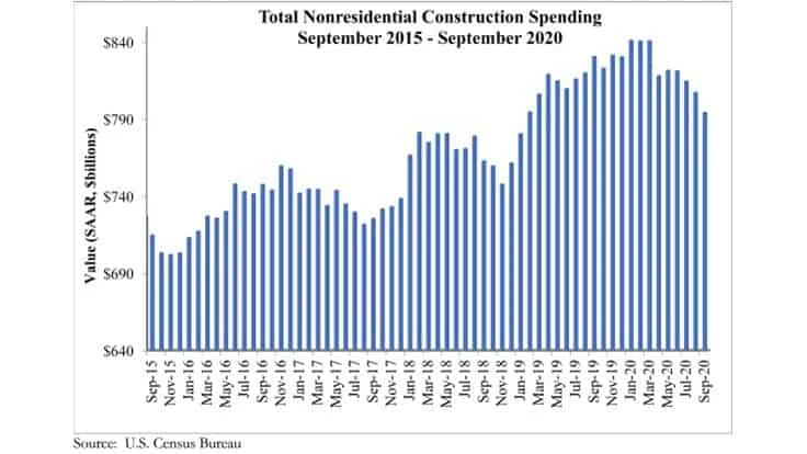 National nonresidential construction spending fell 1.6 percent in September, according to an Associated Builders and Contractors (ABC) analysis of data published Nov. 2 by the U.S. Census Bureau. On a seasonally adjusted annualized basis, monthly spending totaled $794.3 billion.