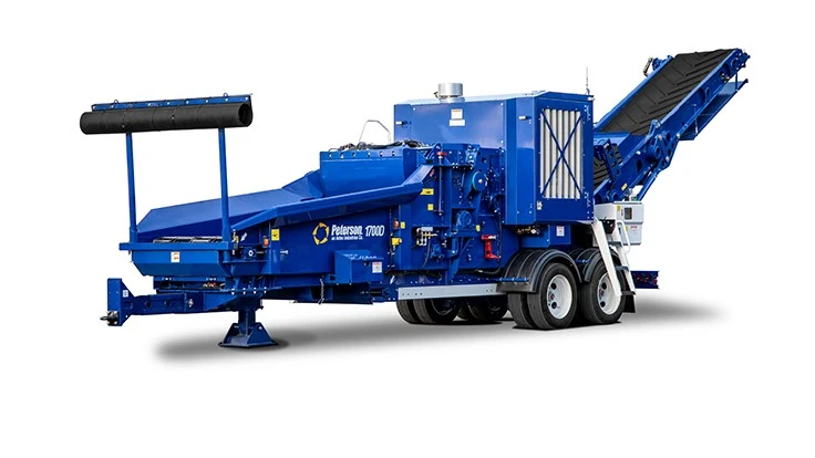 According to the company, the mobile 1700D can reduce a wide range of materials with its large feed opening that measures 54" x 27". When boosted by Peterson’s high-lift feed roll, the feed opening’s maximum lift of 41.5 inches can tackle large feedstock and allows accessibility to the rotor for maintenance.