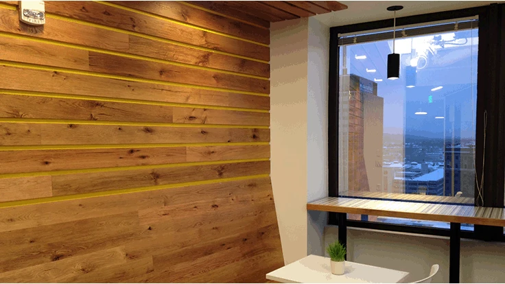 Pioneer Millworks, a Farmington, New York-based reclaimed wood company, has collaborated with Syracuse, New York-based architectural and interior design firm Ashley McGraw Architects to use reclaimed gym flooring and bleacher boards within the design firm’s remodeled office space.
