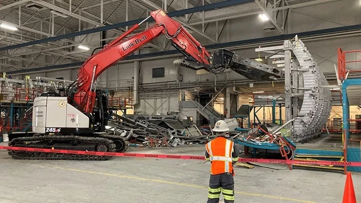 To accomplish the challenging task of removing equipment and fixtures from the site, Long Beach, California-based Resource Environmental opted to bring in a rubber-tracked Link-Belt 245 X4 excavator equipped with a Genesis GXT 225R mobile shear.