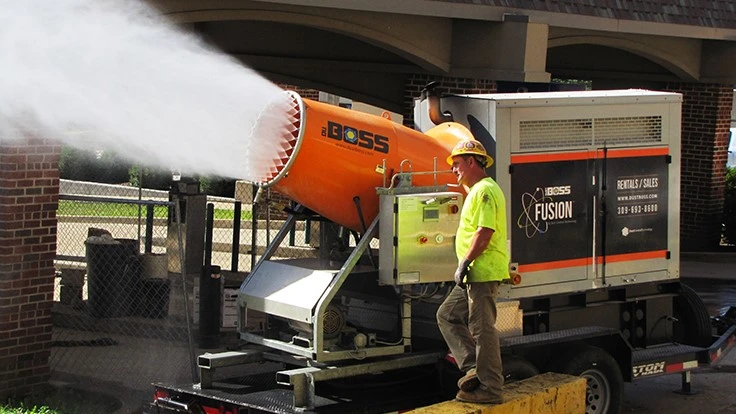 BossTek, a manufacturer of dust control equipment headquartered in Peoria, Illinois, says its equipment was recently used by a demolition firm to contain dust emissions during the teardown of a 5-story concrete parking deck in a densely populated area.