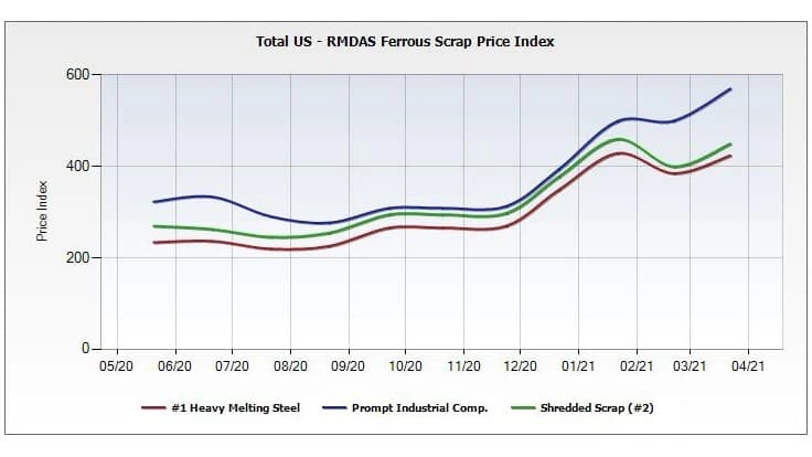 Although the reluctance of some overseas buyers to purchase at a perceived pricing peak is acting as a brake on the value of shredded and heavy melting steel (HMS) scrap, prompt grades have soared in value in the first quarter of 2021.