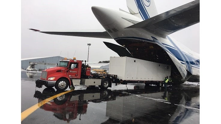 SnapSpace Solutions Inc. (SSI), Brewer, Maine, loaded a fully constructed building onto a jumbo jet Saturday at Bangor International Airport. The restroom structure was commissioned by the Federal Emergency Management Agency (FEMA) to aid children and families after a typhoon devastated Saipan in the Mariana Islands.