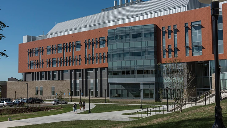 All lighting in the building is governed by sensors so lights go off when no one is in an office, lab or lecture hall. High-efficiency LED lights illuminate the building’s exterior. The building was constructed using locally sourced materials to minimize fuel consumption related to shipping.