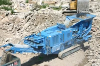 Track-mounted jaw crusher is designed for processing quarried hard rock and construction and demolition debris in recycling applications. It has an output capability of 350 metric tons per hour and uses a hydraulically adjustable version of the “M” series single toggle jaw crusher. It's powered by a 169kW CAT C-9 engine.