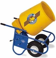 Two-cubic-foot concrete mixer available in a wheelbarrow or pedestal model that measures 24.25 inches wide and has a dump height of 27.5 inches. It swivels a full 360 degrees and is powered by a one-third horsepower electric motor. It also features adjustable handles, poly drum and steel mixing blades.
