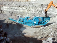 This track-mounted, fixed-hammer horizontal impact crusher is designed for crushing aggregates and concrete/asphalt rubble. It has a 42-inch by 28-inch feed opening and can crush up to 400 tons per hour with a 20:1 reduction ratio. The unit uses a variable speed 12 foot, 6 inch by 42-inch grizzly feeder. The hopper has a capacity of up to 5 cubic yards, depending on the feed method. Dust suppression is provided by spray bars with atomizer nozzles mounted over the impactor discharge point and the product conveyor head. The machine is powered by a Caterpillar C-9 engine with 300 hp. Options include high manganese or high chrome blow bars, four full-size blow bars in lieu of two full and two half size and a single idler belt weigher with integrator and speed-sensing wheel fitted to the main product conveyor.