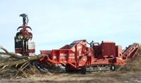 The redesigned Morbark Model 4600XL Track Wood Hog combines durability and high horsepower options of bigger models like the 6600 while still meeting the road weight requirements of smaller machines. It weighs 82,000 pounds. The hammermill is 14 percent larger than its predecessor, increasing the tip swing to 36 inches. It has power options up to 860 hp. A Caterpillar 325L is the standard undercarriage. The 4600XL uses Morbark’s Iqan Feed System.