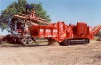Tracked model horizontal grinder designed to move and grind simultaneously. It has remote control of all machine functions so it can be operated from the cab of an excavator or loader while feeding the machine.