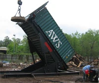 Container tipper is designed to ease loading of bulk products into containers. Container and trailer chassis are backed into the unit, and container is locked at eight points onto the tilter’s lifting arms. Tilter hydraulically raises the container from 0 to 90 degrees for loading with a loader, material handler and conveyor.