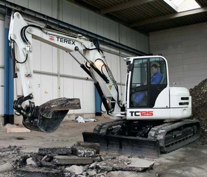 Designed for trenching and excavating in space-restrictive applications, the zero-tail swing Terex TC125 Compact Crawler Excavator achieves exceptional maneuverability on congested job sites and works in parallel-to-wall operations with ease. The load-sensing and load-independent flow division hydraulics system is matched to the machine’s size to give operators a greater power ratio and smooth, simultaneous operation for maximum worksite production. Weighing 27,563 lbs (12,500 kg), the TC125 has a maximum dig depth of 15 ft 4 in (4.67 m) and a maximum reach of 27 ft 2 in (8.28 m). This 94-hp (64 kW) unit offers bucket capacities from 9.18 – 31.86 ft3 (260 – 902 L).