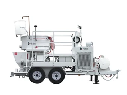 The MX-10 features a 2,200-pound capacity, high-torque hydraulic pan mixer, which offers a mix time of two minutes or less. Combined with an ultra high-pressure, 2,200-psi (pounds per square inch) piston pump, the unit is able to consistently deliver 10 tons of material per hour and achieves vertical pumping distance of up to 300 feet.
