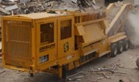 Primary shredder breaks C&D material down for more efficient sorting and packing. The feed opening measures 8 feet by 10.5 feet. And the machine features adjustable anvil and automatic purge cycle. Powered by dual Hagglunds car-crusher style radial piston motors, the system comes in stationary or portable configurations with optional electrical or diesel power plants.