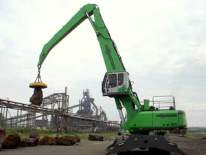 The Sennebogen 860 M is a 165,000-pound rubber-tired material handler designed for use in heavy duty lifting applications such as scrap recycling yards, steel works and port facilities. The new 860 model is also available as a crawler-mounted “R-HD” model in the 180,000-pound range, as well as in a wide range of optional configurations, including rail, barge, gantry and stationary pedestal mounts.
