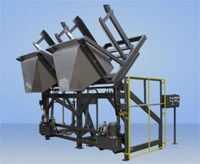 Unit features two independently actuated dump carriages. Containers are loaded at floor level with a pallet jack, discharging product at 69 inches above floor level. Lift & Seal System hydraulically seals containers to the pour hood, eliminating dust and product contamination. Unit features a washdown duty tubular carbon steel frame, Steel-It epoxy finish and 304 stainless steel product contact surfaces.