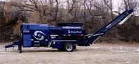 Industrial tub grinder featuring a 275-hp John Deere electronic diesel engine that meets EPA Tier II requirements. A PT-Tech self-adjusting clutch connects the engine to the mill and features pushbutton start and a built-in torque limiter and break. It features a self-cleaning rotary screen and a 22-foot stacking conveyor. An optional tub cover is available. The tub measures 9 feet 6 inches in width and 7 feet 6 inches in diameter at the base. It produces up to 120 cubic yards of material per hour and is available with 32 fixed or 64 swinging hammers.