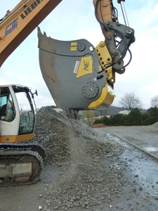 The bucket's new and improved design includes a new shape that enhances digging performance, a new pin locking system, an interchangeable crushing jaw, a reversible and exchangeable crushing plate, weld-able hard face wear parts surfaces, all wear steel made out of Hardox 400, heavy duty replaceable bucket teeth’s, easy adjustment to change material size, centralized lubrication point and a flow regulating valve for adjusting crushing speed.