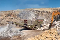 Track mounted jaw crusher designed for hard rock, recycling and demolition debris applications. It has self-contained diesel power with full hydraulic controls for feeder, jaw crusher, conveyor, tracks and optional cross belt magnet. It has a loading height of 11 feet, 5 inches and a variable speed step deck vibrating feeder for separating fines. It also features hydraulic wedge adjustment.