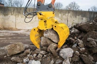 Atlas Copco Construction Tools has introduced its new line of hydraulic demolition grapple attachments. The new multi grapples feature large hydraulic cylinders that provide high closing forces and short cycle times, making the attachments ideal for sorting and loading rubble, as well as demolition of masonry and wooden structures. The MG 1000 delivers a maximum closing force of 4.7 tons and is suitable for carriers in the 12-to 20-ton weight class. The MG 1000 operates at a maximum pressure of 5,076 psi and requires hydraulic oil flow of 22-to 32-gallons per minute (gpm). The grapple jaws of the MG 1000 open to a width of 77 inches and can handle a load capacity if 0.65 cubic yards. The MG 800 provides 3.8 tons of closing force and fits carriers between 9 and 16 tons and accepts oil flow of 18 to 26 gpm at 5,076 psi. The MG 500 offers 2.4 tons of closing force and can be used on 5-to 9-ton carriers and requires oil flow of 10 to 13 gpm at 4,351 psi. Both the MG 800 and MG 500 provide jaw opening widths of 67 and 59 inches and load capacities of 0.52 and 0.26 cubic yards. A standard 360-degree hydraulic rotation unit on each multi grapple allows for accurate positioning of the attachment to accelerate work progress.